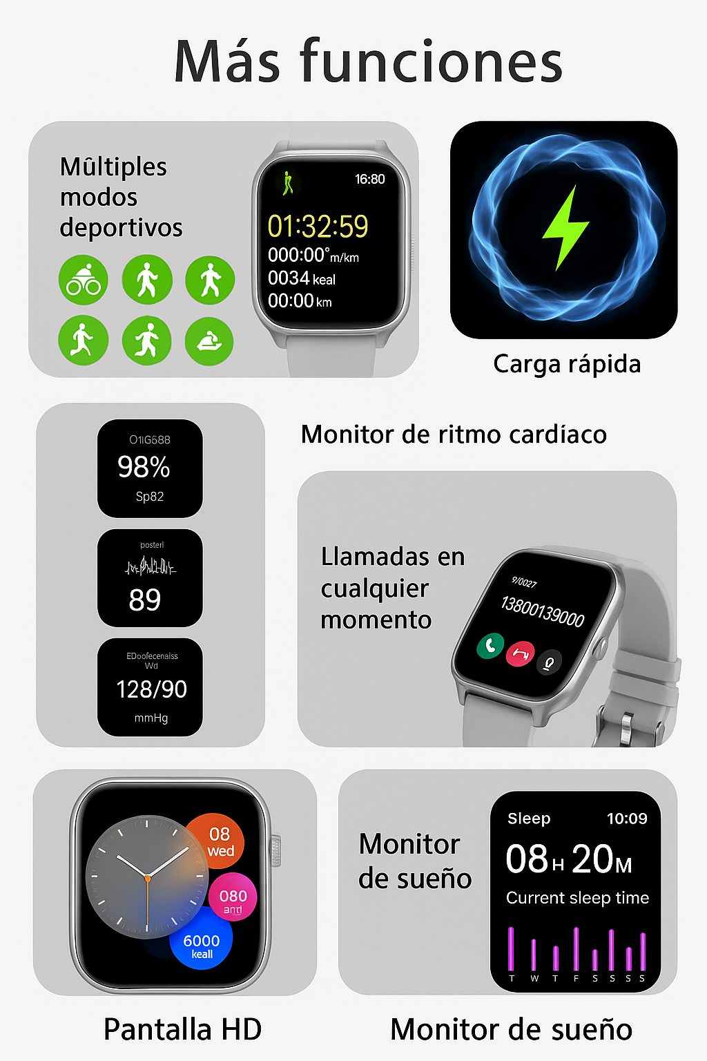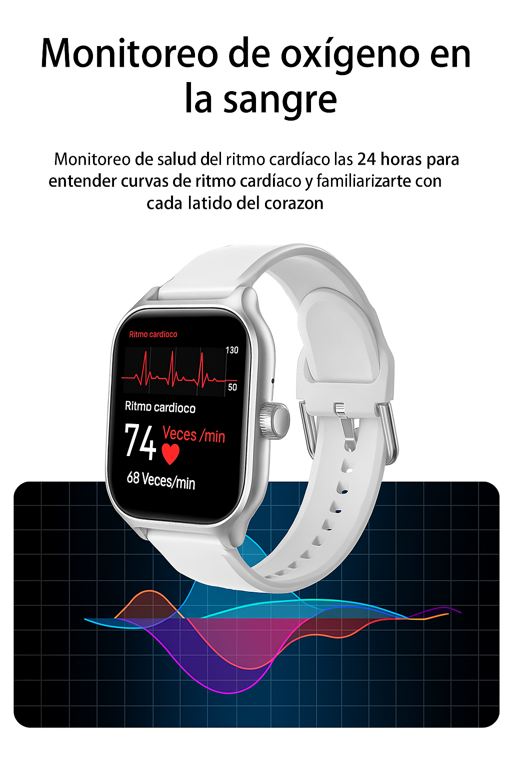 Llamadas BT, alertas inteligentes Monitoreo de frecuencia cardíaca/presión arterial, ECG |